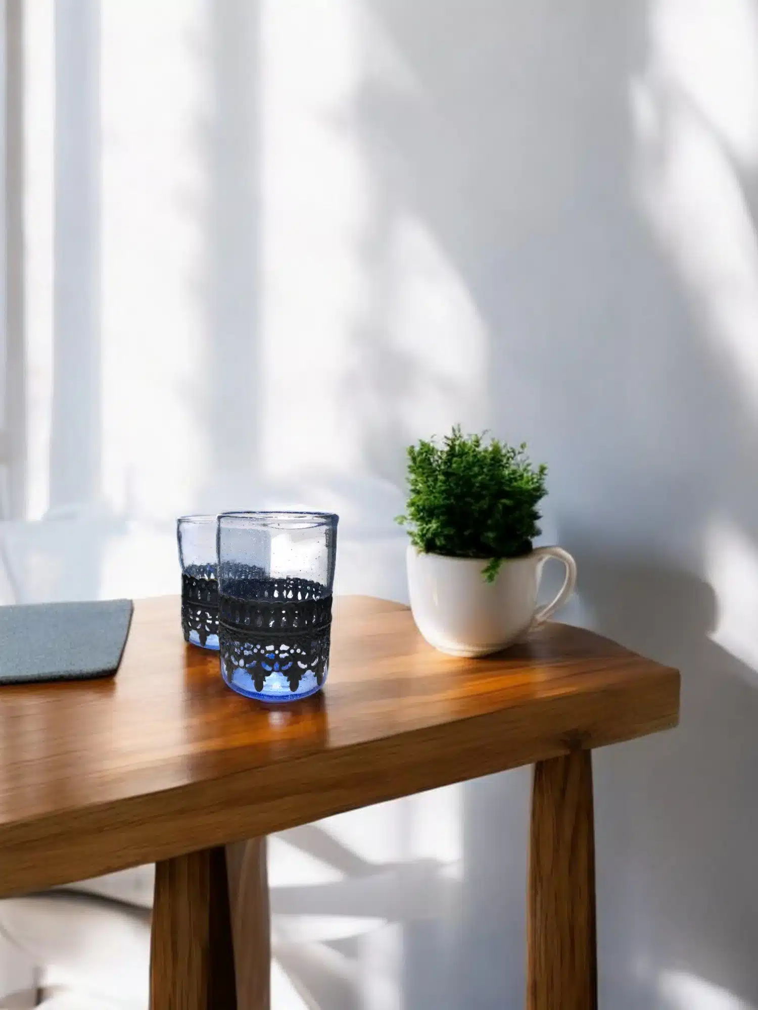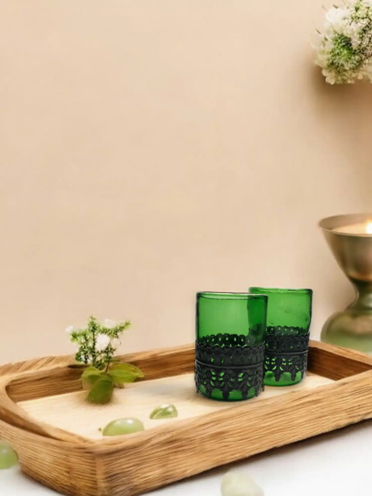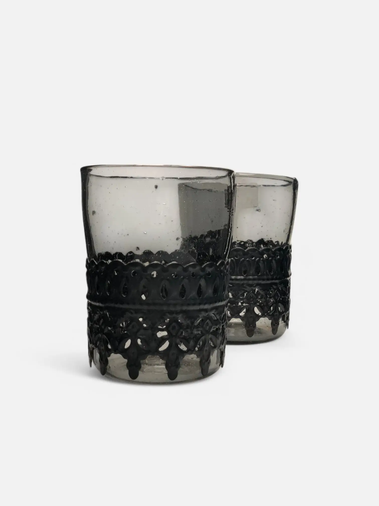 Handcrafted in Egypt, this set of two green glasses combines recycled glass with hand-applied metal detailing. Each piece is mouth-blown using traditional techniques, giving it an organic character and unique imperfections that reflect true artisanal work. The dark ornamental band adds a striking contrast, making these glasses both functional and decorative.