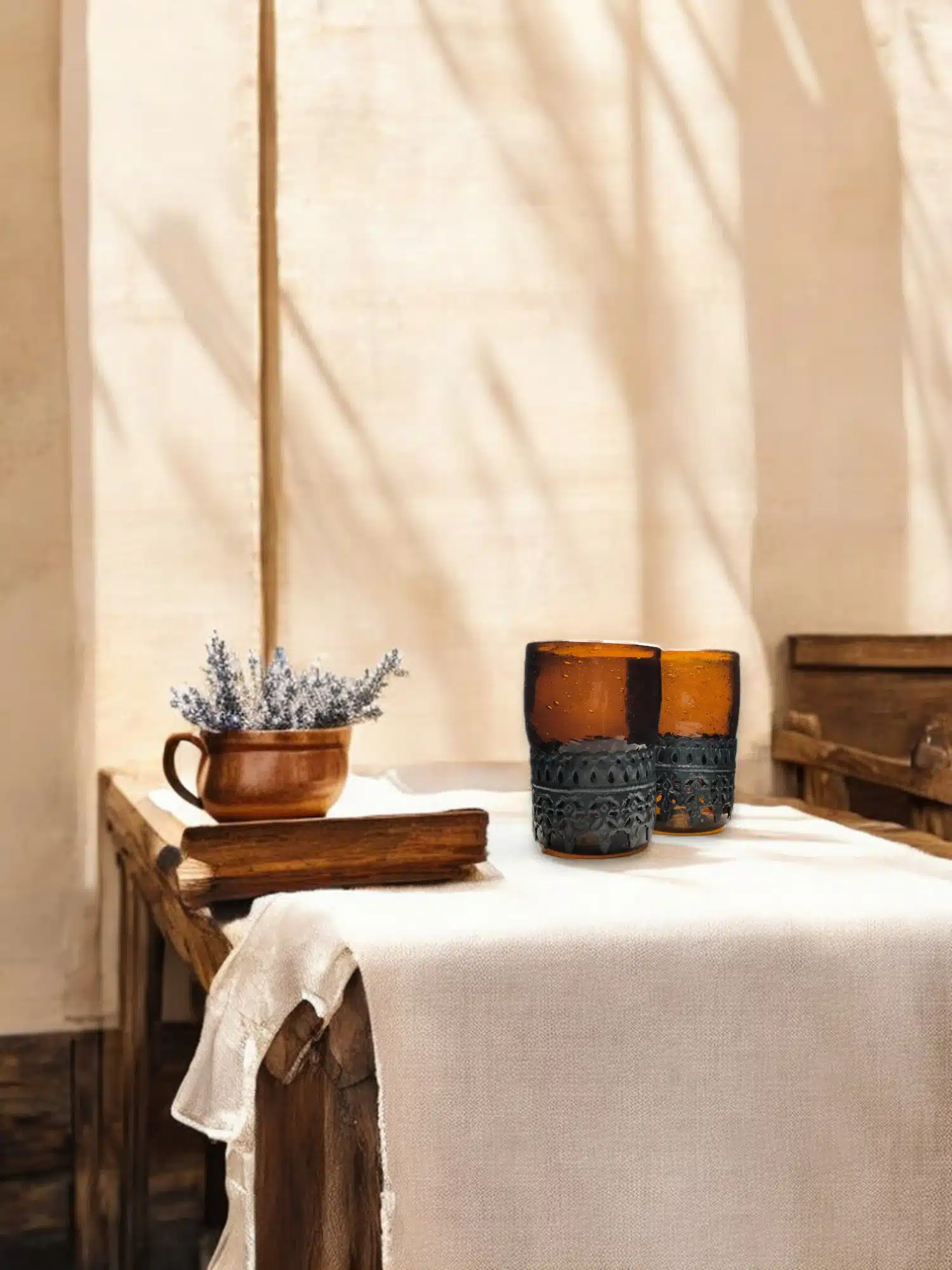 Worn woods, sunlit linens, and handcrafted textures bring out the richness of the brown glass — grounding the space with warmth and tradition.