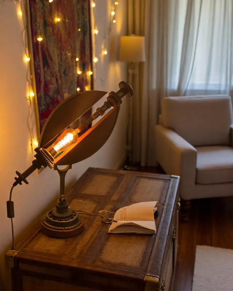 This lamp began life as machine parts — gears, shafts, and fittings. Now, they’re transformed into a functional object with story and soul.
