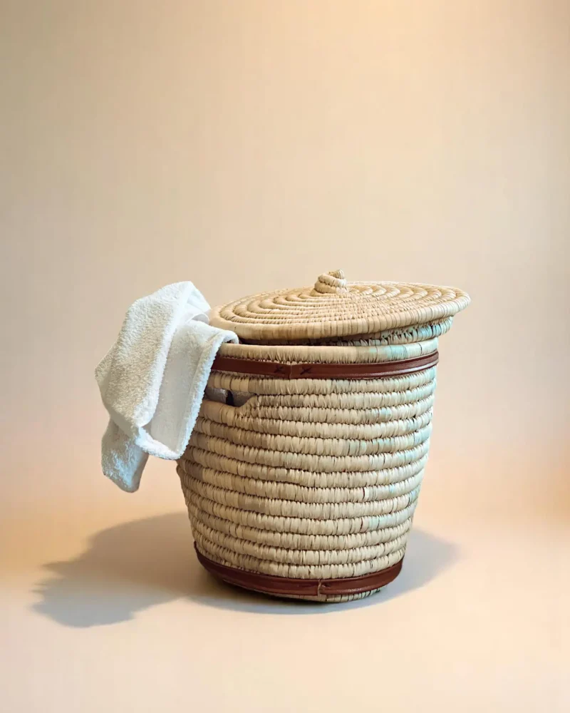 A large conical basket with a snug-fitting lid and leather stripe accents — handwoven from dried palm leaves in soft natural tones. Durable and versatile, it’s ideal as a laundry basket, towel storage, or even for pantry use.