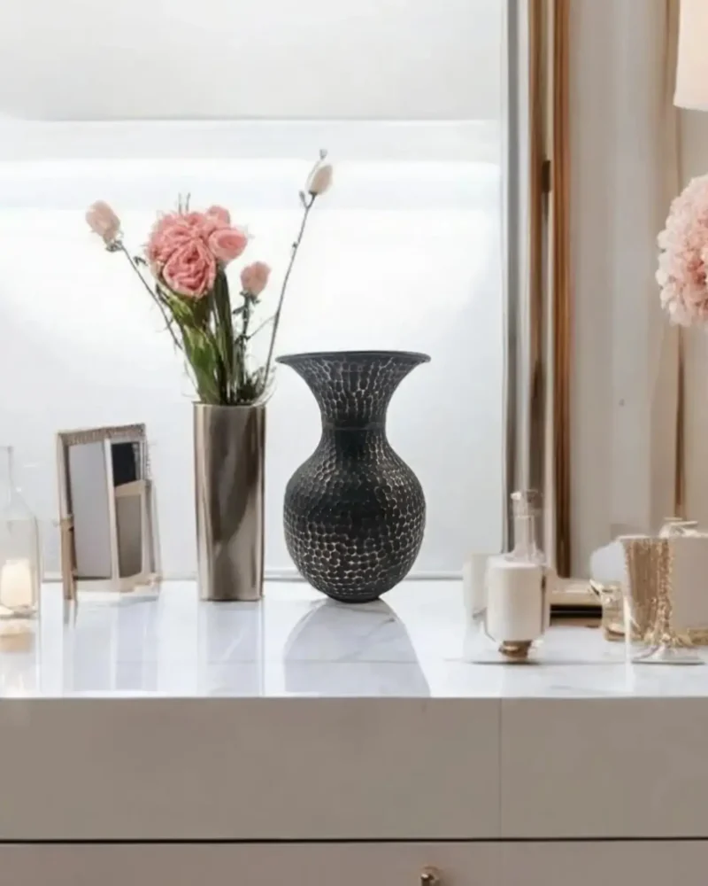 A handmade vase crafted from solid copper with a timeless silhouette and rich hand-hammered texture. Available in two refined finishes — red copper or deep matte black — each piece adds a bold, artisanal touch to any space.