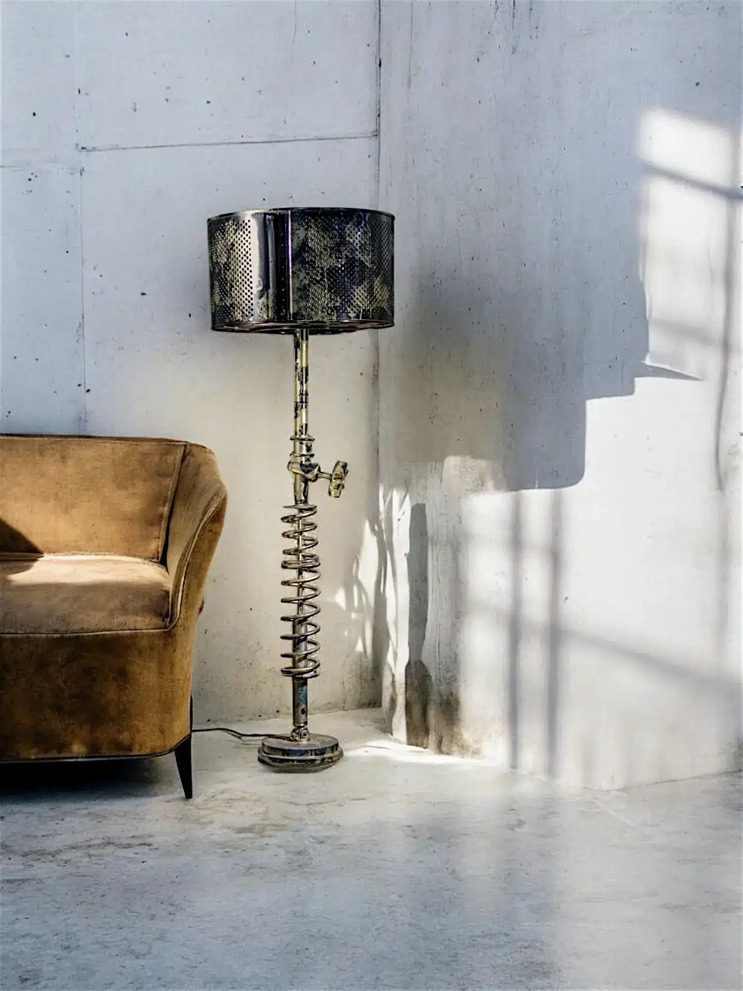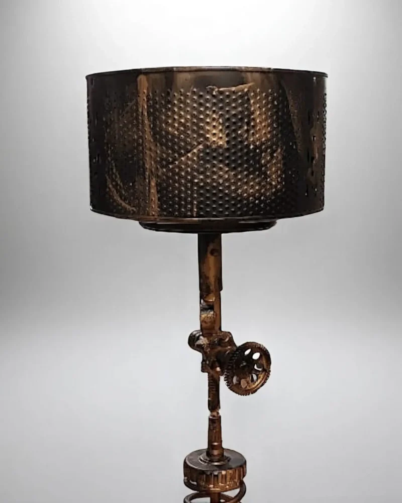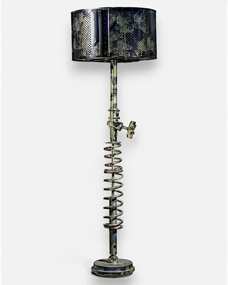A bold, handcrafted floor lamp made from repurposed car parts like crankshafts, gears, and springs. The striking lampshade is upcycled from a black steel washing machine drum, giving the piece a powerful industrial aesthetic. Each lamp is individually assembled — no two are the same.