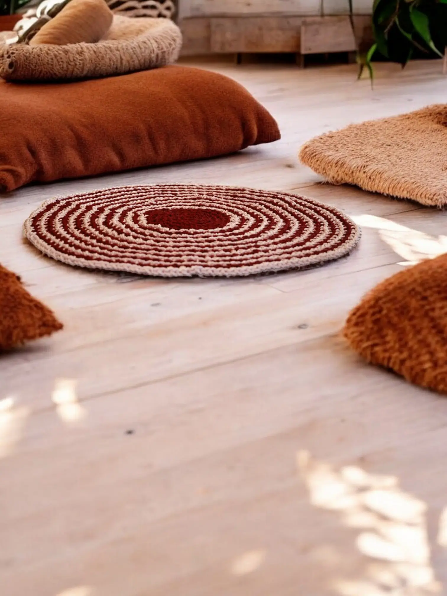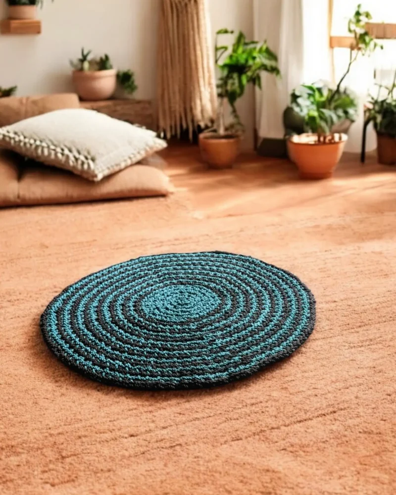 A round, hand-crocheted rug made from durable, high-quality fabric yarn. Its bold spiral design and soft texture make it ideal for the floor or even as a decorative table accent.