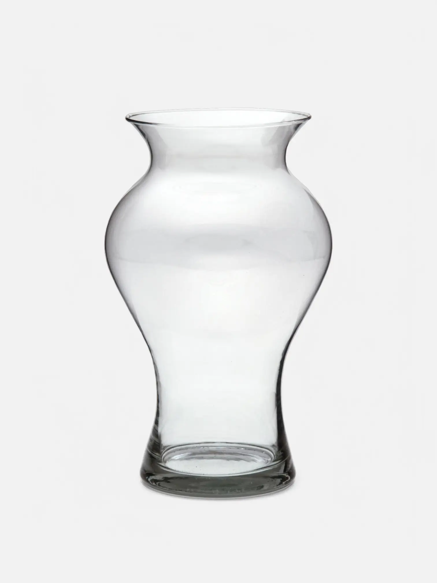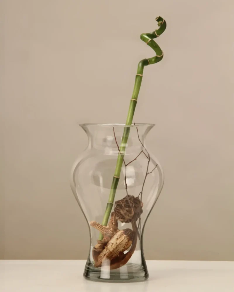 A hand-blown clear glass vase with a rounded base and wide opening. Elegant and versatile — perfect for bouquets, candles, or decorative accents like stones or gravel.