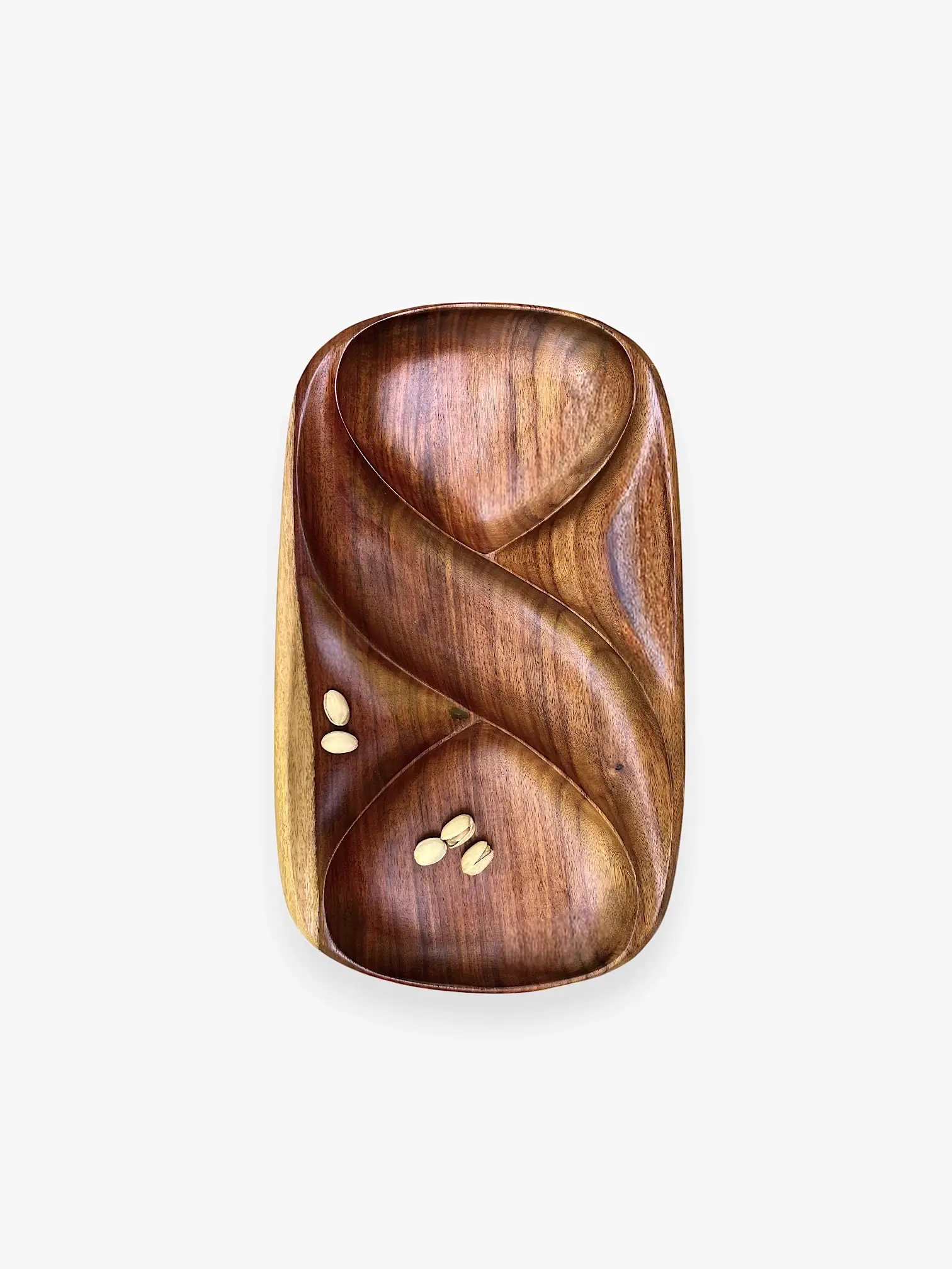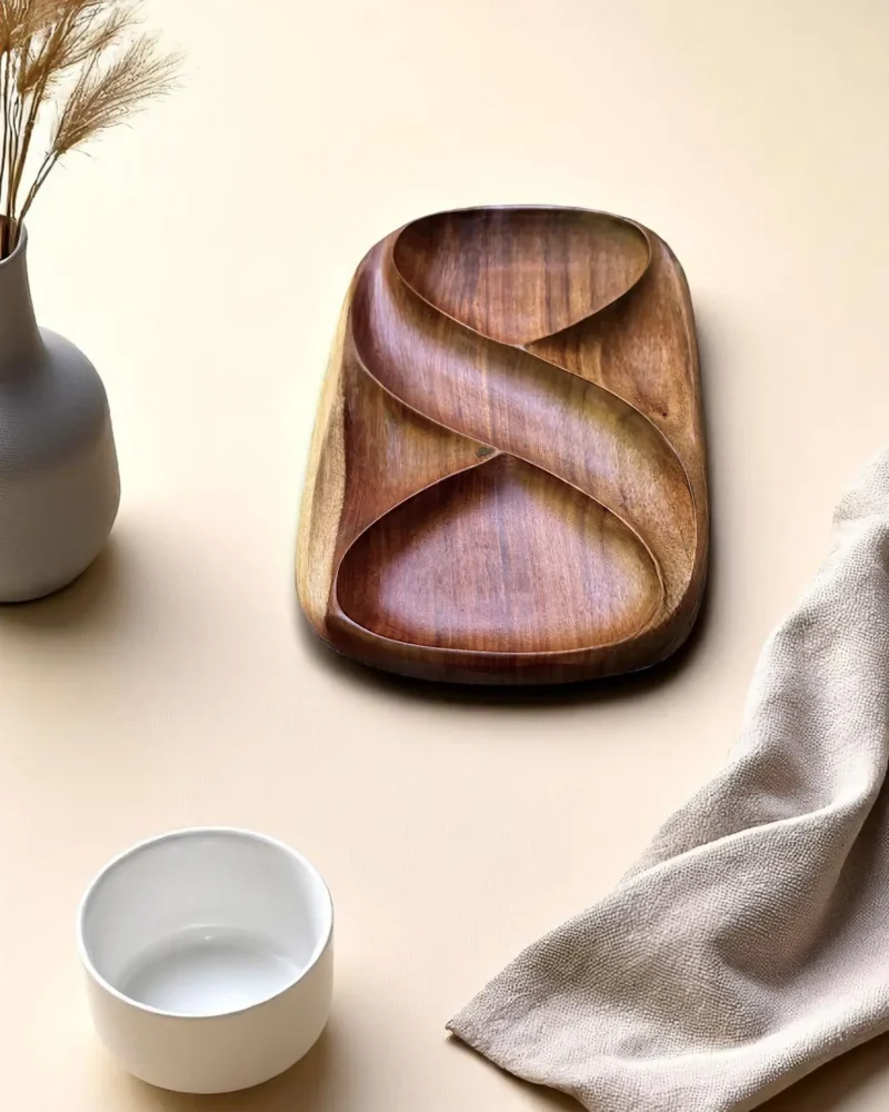 Beautifully hand-carved from rich sheesham wood, this serving piece blends functionality with sculptural charm. Its warm brown tone and flowing contours make it ideal for modern or traditional interiors.