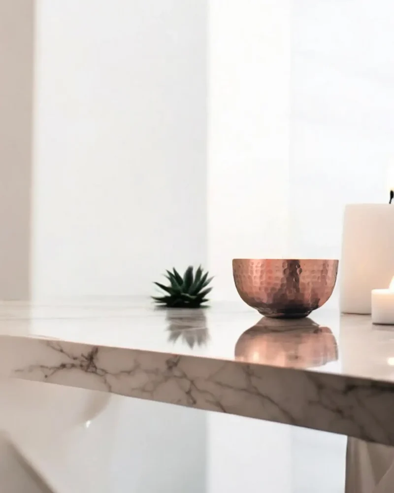 A handcrafted, round bowl made from polished copper with a delicately hammered surface. Elegant in shape and size, perfect for candles, fruit, or decorative accents.