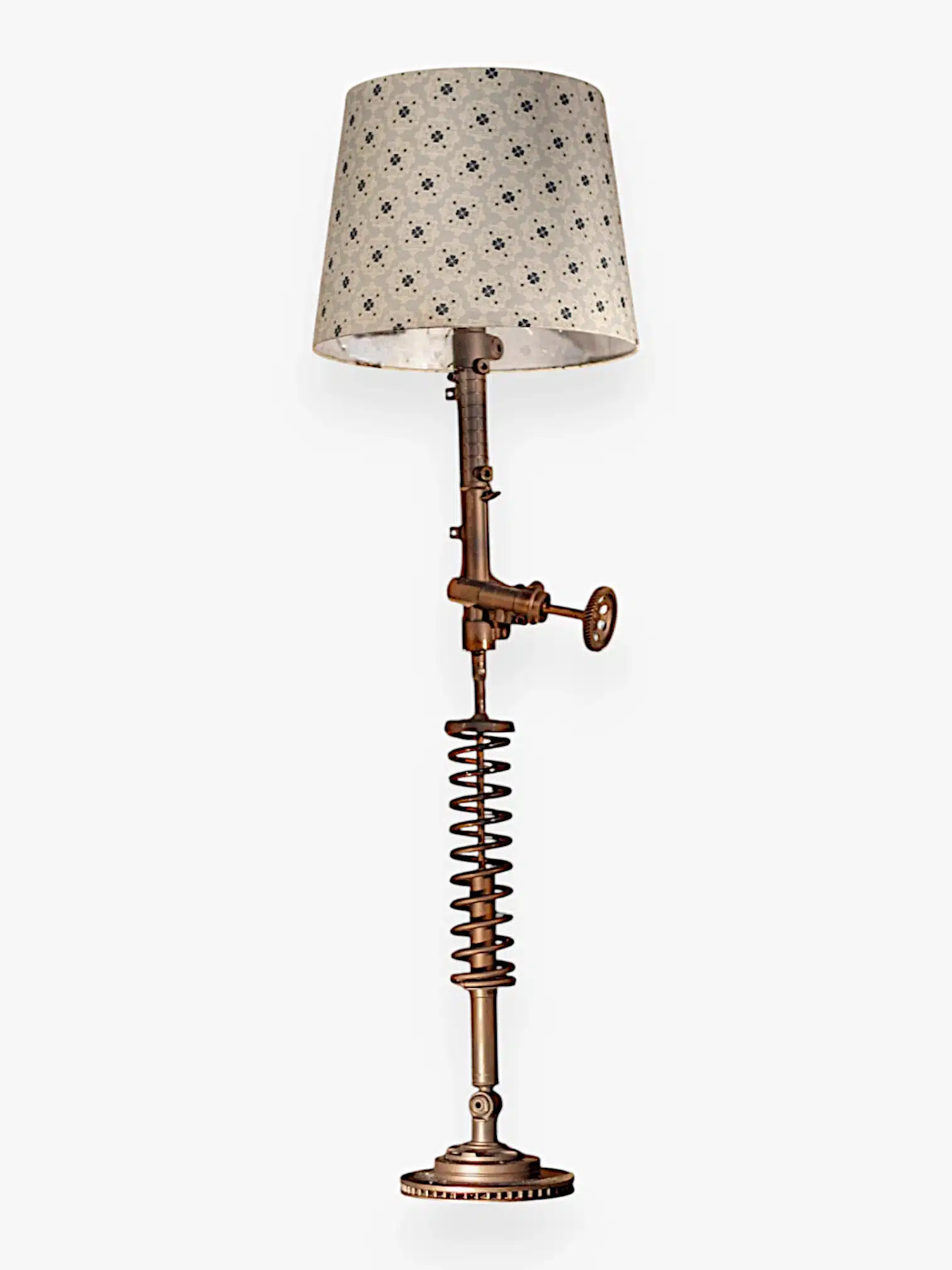 A striking floor lamp crafted from reused car parts — including the crankshaft, cams, and gear wheels — seamlessly fused into a solid industrial base. The soft white fabric lampshade adds an elegant contrast to the mechanical structure, creating a piece that feels both raw and refined. Each lamp is handcrafted and one of a kind.