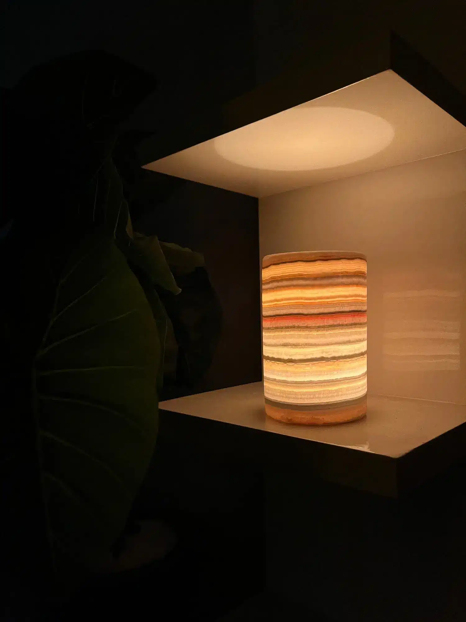 A refined set of two tall, cylindrical alabaster candle holders designed for tea lights. They create a warm, ambient glow — perfect for adding a subtle decorative touch to any room. Each piece features unique natural grain variations.