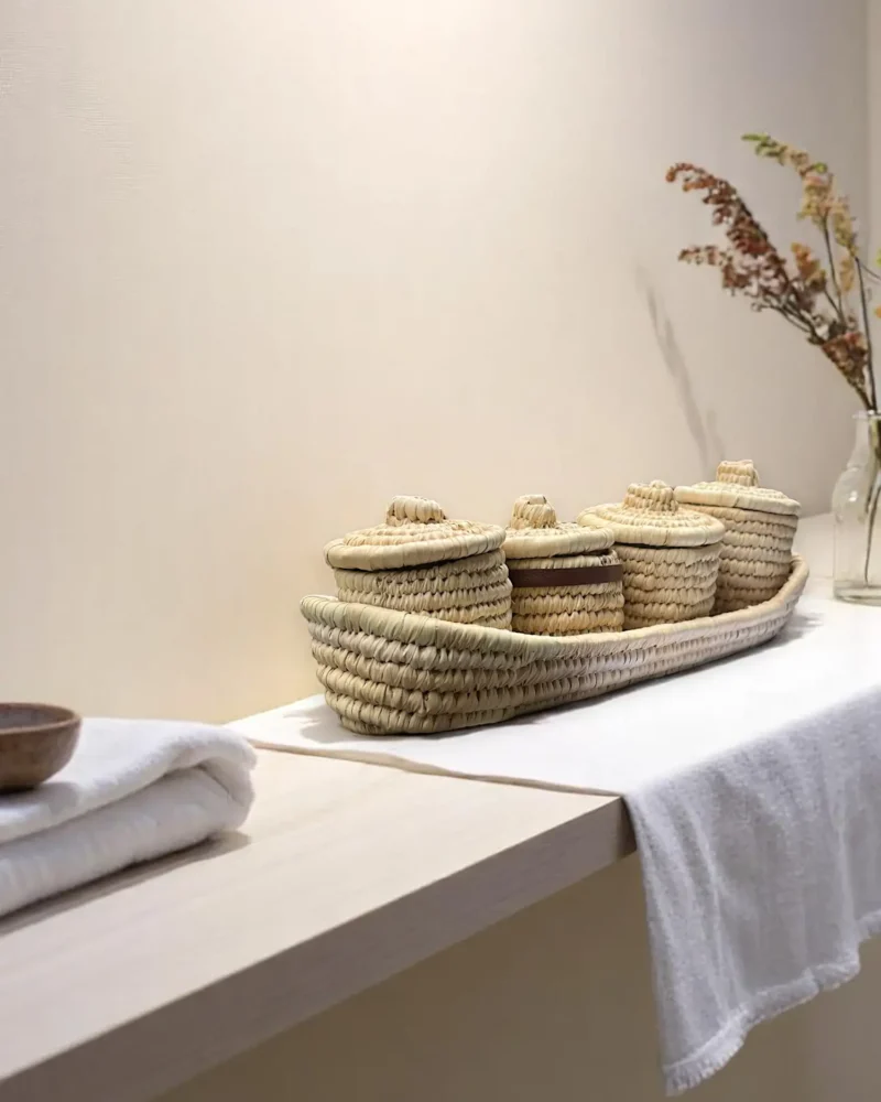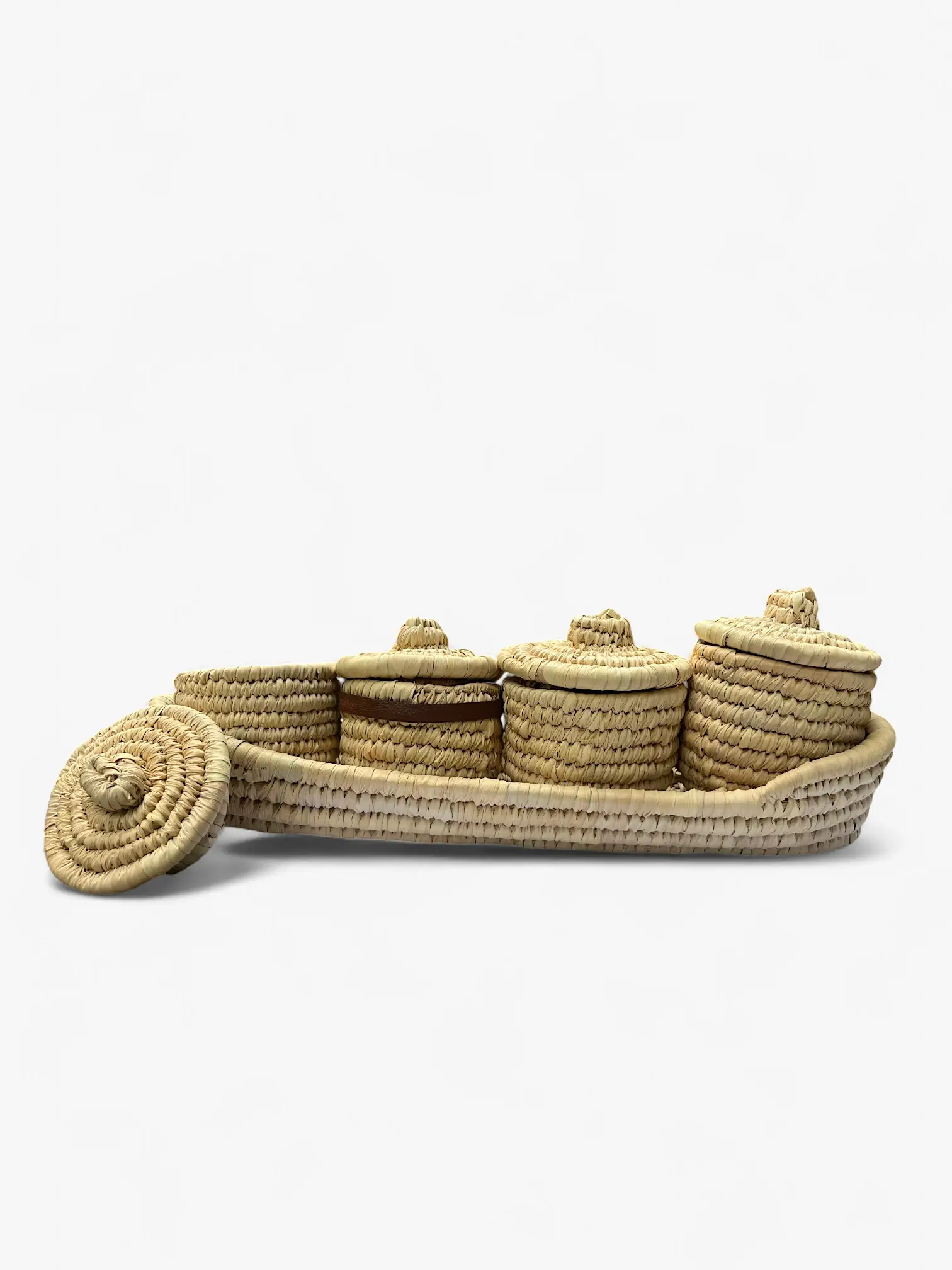 A handcrafted palm leaf basket set featuring four small lidded containers attached to a sturdy tray — each finished with faux leather accents. Compact, natural, and ideal for organizing jewelry, keys, or cosmetics.
