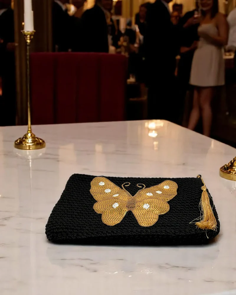 A bold black evening clutch, hand-crocheted and embellished with a gold sequin butterfly — a true statement piece. Lined with soft fabric and finished with a gold tassel zipper, it’s a stylish handbag alternative for special occasions or night outs.