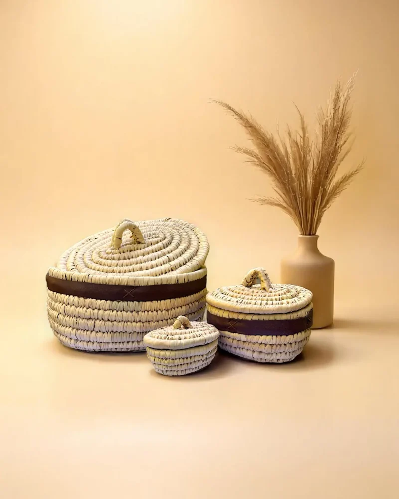 A handwoven set of three oval baskets with matching lids, crafted from dried palm leaves. Lightweight yet sturdy — ideal for organizing toys, textiles, or bathroom essentials.