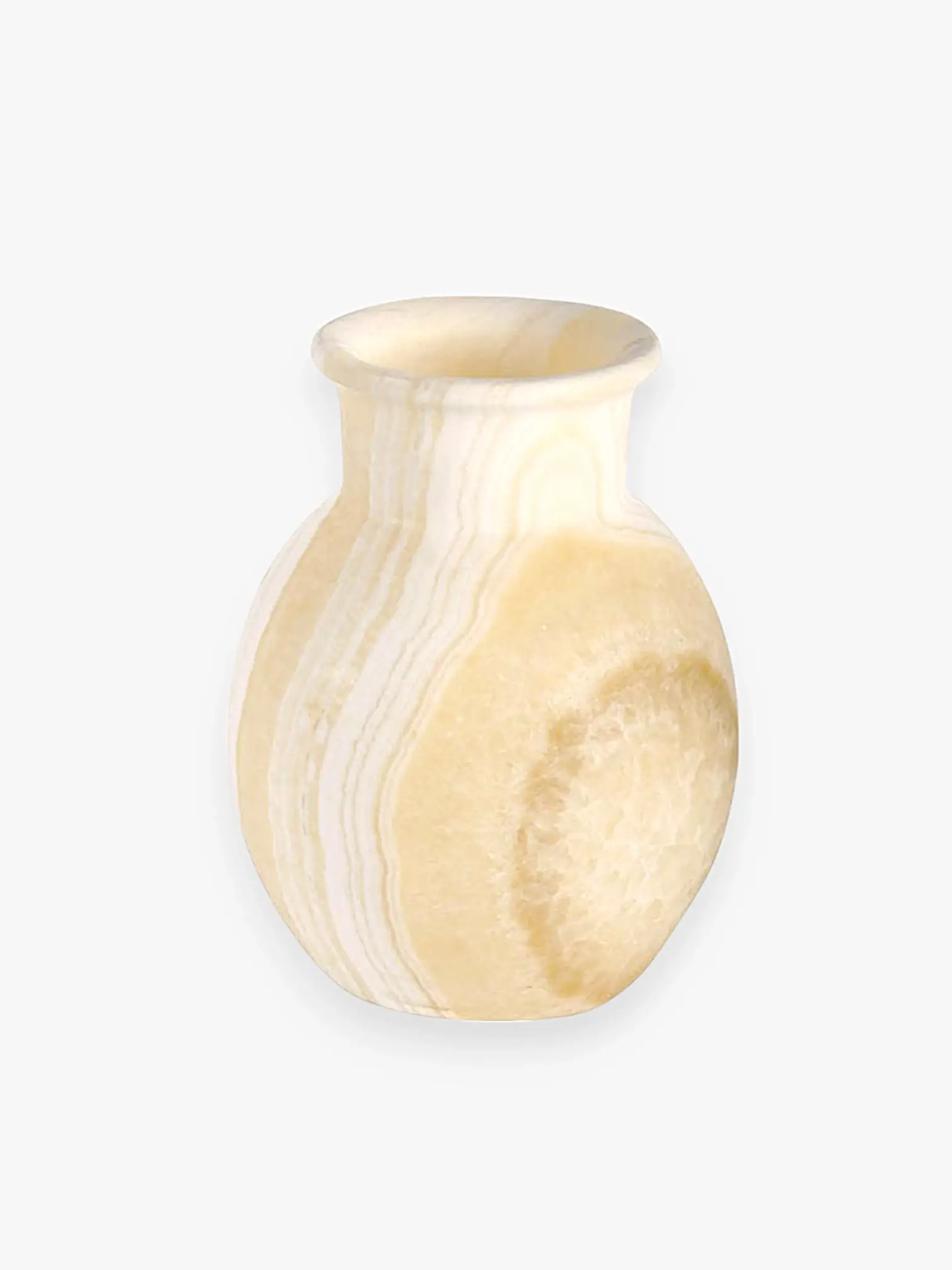 A large, handcrafted table lamp shaped like a sculptural vase. Made from natural alabaster, its glowing body casts a soft, diffused light while showcasing the stone’s unique veining. A statement piece for calm, elegant spaces.