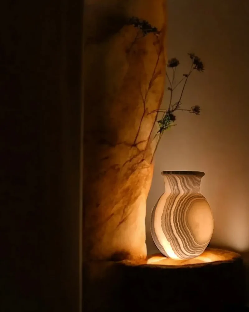 Carved from pure alabaster, each lamp reveals flowing grain patterns that glow warmly when lit.