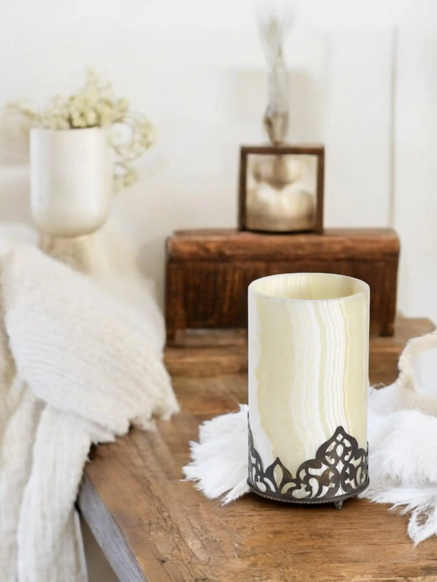 This elegant table lamp is carved from solid alabaster into a tall, cylindrical form. Available with or without a filigree metal base. The alabaster’s unique veining and soft translucence bring character to both rustic and modern spaces — perfect for sideboards, bedrooms, or cozy corners.