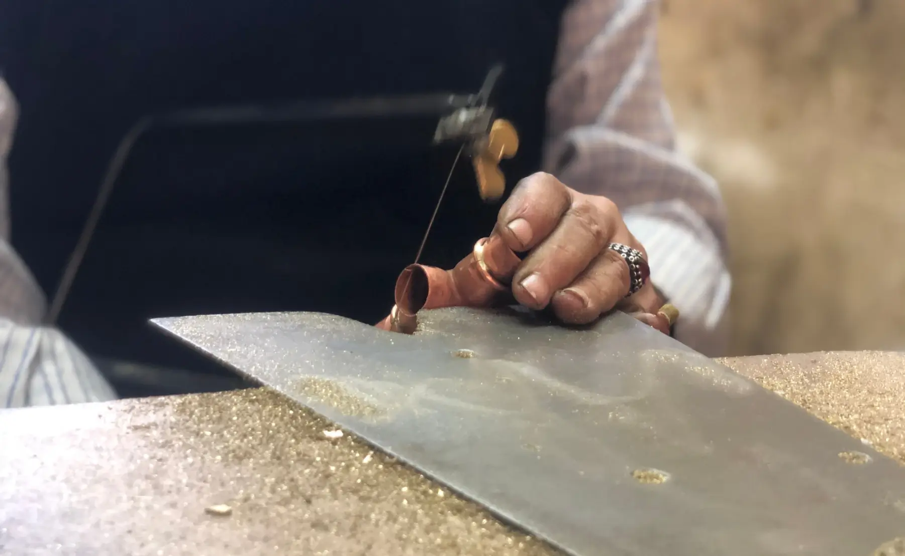 The copper components are cut and shaped by skilled artisans using traditional tools — as shown in the image. Each piece is fire-treated to bring out copper’s natural color variations, from deep red to golden bronze. Every detail is handled with care, not machines.