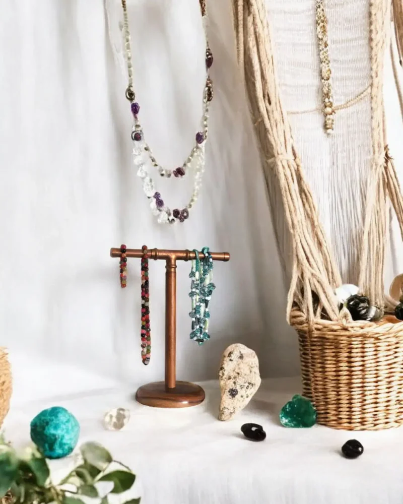 This handcrafted jewelry holder combines solid Sheesham wood with a red copper T-bar — a stylish way to organize necklaces, bracelets, and earrings. Each piece is handmade and unique in grain and color.