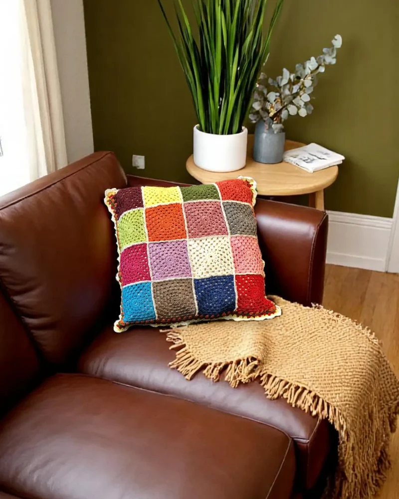 The patchwork of granny squares is arranged in a joyful mix of tones, creating a colorful, eye-catching accent.