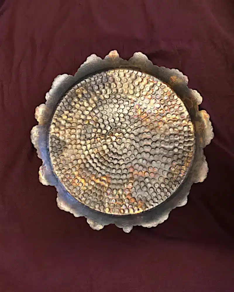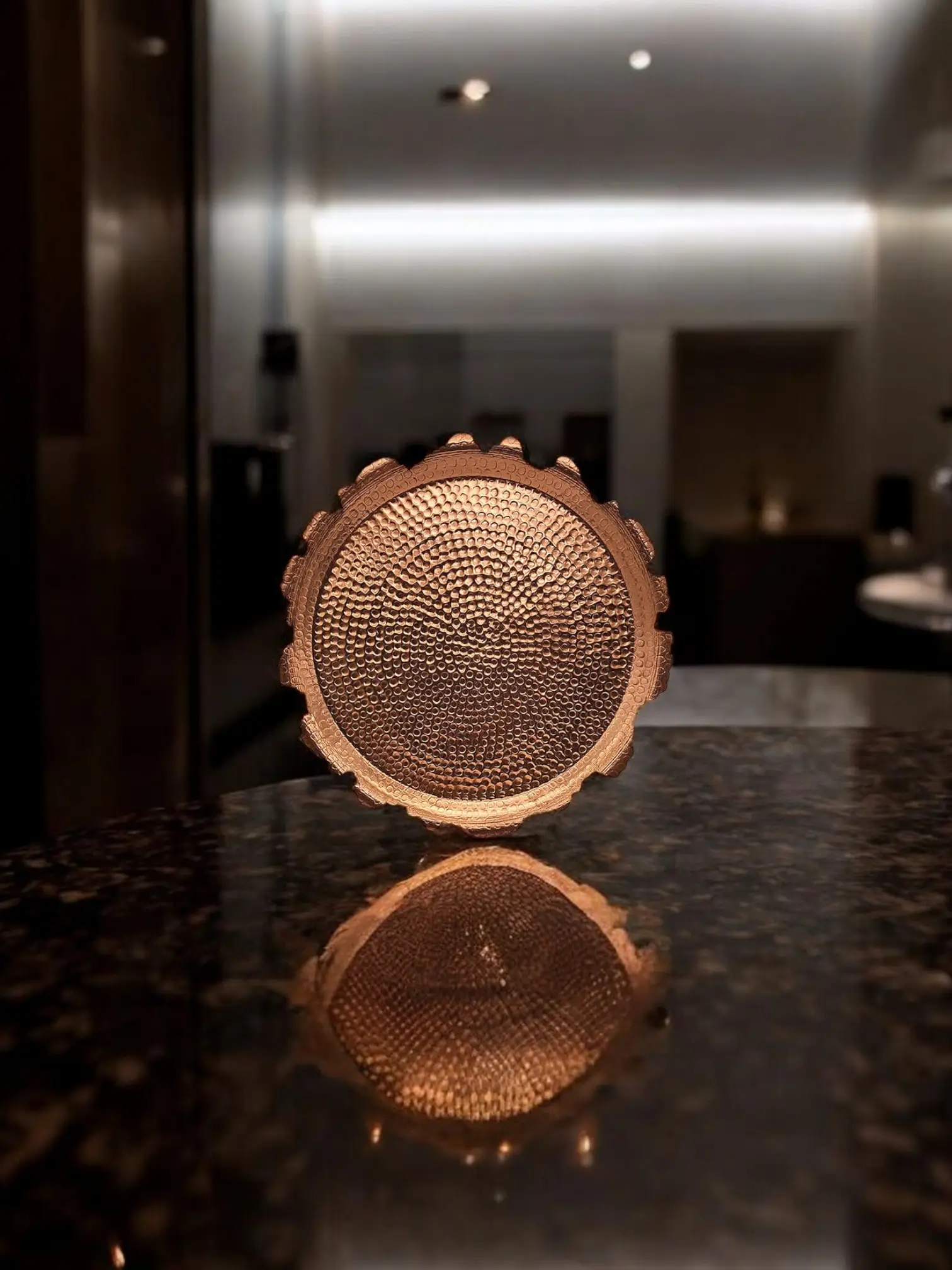 A beautifully crafted round tray made from solid copper, featuring a fine hammered texture and artistically scalloped edges. Perfect for serving, styling, or daily use in any room. Available in three unique finishes: natural red copper, deep black oxide, or iridescent oil-slick tones.