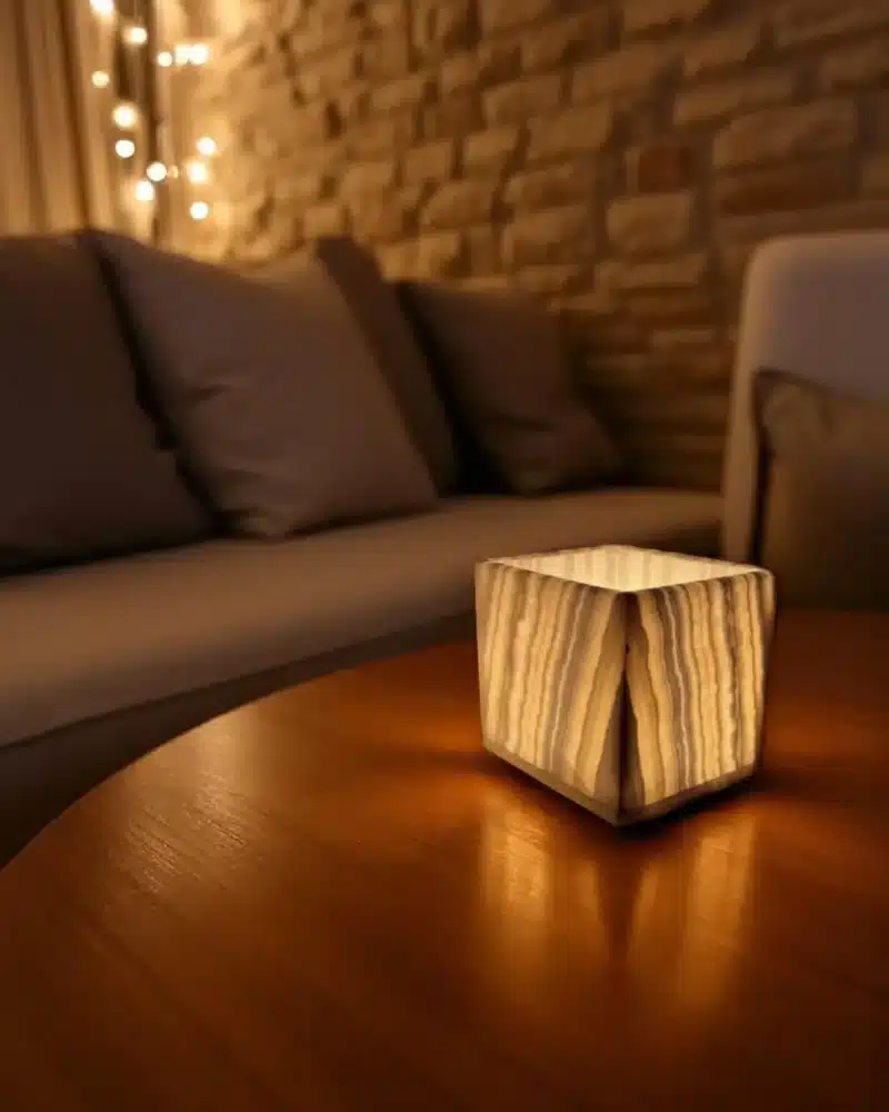 Hand-carved from solid alabaster, each piece features organic veining and a translucent finish that glows from within.
